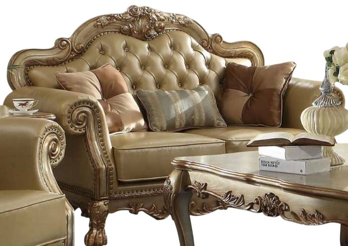 The Dresden gold patina and bone faux leather loveseat has a traditional feel, featuring decorative carvings, inlay veneer ball and claw feet and hand brushed gold accents. The seat and back have a faux leather button tufted cushion with Nailhead trim.Read More
