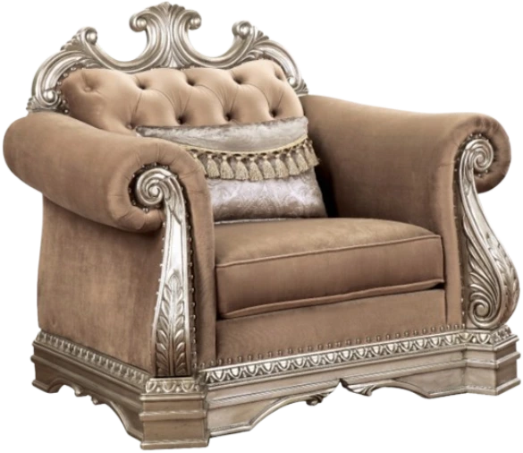 The Northville Chair is exclusively designed and filled with romantic spirit. This beautiful velvet upholstered chair features carved legs, apron, and trim, decorated with raised and scrolled floral motifs in an antique silver finish. This chair boasts of curved and rolled arms, oversized molding and button tufted backrests with nailhead trim.Read More
