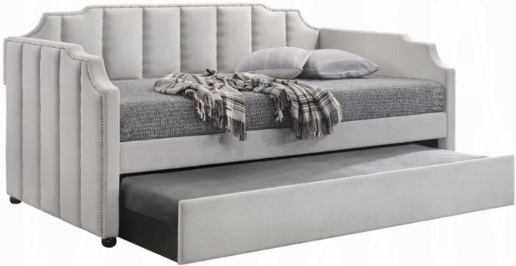 The Peridot traditional vintage upholstered daybed with trundle brings relaxed elegance and comfort to your home. It is crafted with engineered wood and thick foam padding around the frame for added comfort. The smooth velvet upholstery features horizontal tufting, nailhead trim, and an arched frame gives a tailored look.Read More