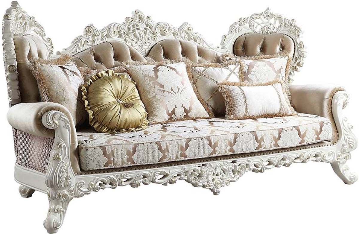 The Vanaheim Antique White Sofa is a luxurious and elegant piece that enhances any living space. This sofa features a timeless design with fabric and antique white finish, complemented by crystal-like button tufted backrests and raised scrolled molding trim.Read More