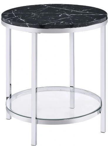 Infuse your small space with big style. The end table combines modern flair with functional design. Table metal frame in a chrome finish exudes lustrous shine, topped with faux black marble that boasts brilliant reflective properties.Read More