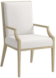 The chair features a straight, high back and a generously cushioned seat, both fully upholstered in a light, neutral fabric that complements a variety of dining aesthetics. The chair's frame, crafted from a light, natural wood, showcases a sleek, minimalist design, with gently curved armrests that add a touch of elegance and support. The clean lines of the frame are further enhanced by the slender, tapered legs, which contribute to the chair's overall sense of lightness and sophistication. The Eave II Dining Armchair is designed to provide both comfort and style, making it a perfect addition to any dining table, whether for everyday meals or formal gatherings. Its refined design allows it to seamlessly integrate into a variety of interior styles, adding a touch of understated luxury.