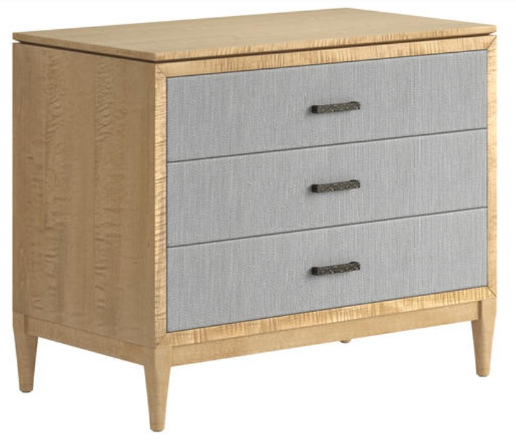 Classic contemporary 3 drawer bedside chest in figured maple, textured gray fabric. A Celebration of crisp lines and beveled edges, this collection offers over 20 designs in figured maple veneer, complemented by fabric-wrapped, or organic jute cord accents. Perfect for metro, urban, or contemporary homes.Read More