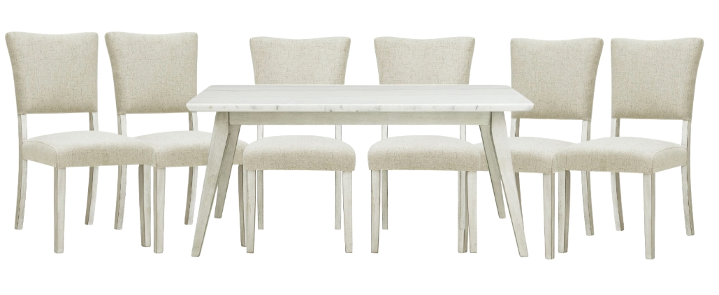 A dining set that is simple in beauty and provides a touch of contemporary style. The table pairs a light wood finish with a beautiful white top marble for the perfect touch of airiness. Each chair is upholstered with a clean white fabric and filled with foam to provide a comfortable seat and backrest.Read More