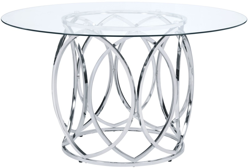 The Merlin Round Dining Table is what you have been shopping for! The ultracontemporary dining table is created with a tempered glass table top and a sleek, chrome table base. Circular designs accent the round drum table base. This table can accommodate up to four people comfortably, with standard dining height chairs. This dining table can be perfect for intimate family dinner or a cocktail party with friends. Pair this table with upholstered side chairs or arm chair set to complete the ultracontemporary setting.