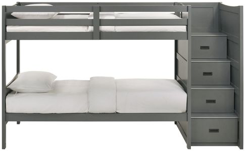 The Sami twin over twin step bunk bed combines space-saving design with practical storage for youth bedrooms. Finished in gray, it features four step-integrated drawers for organized essentials. With a right-side headboard and sturdy construction, this bed offers durability and style while maximizing room layout and everyday comfort.Read More