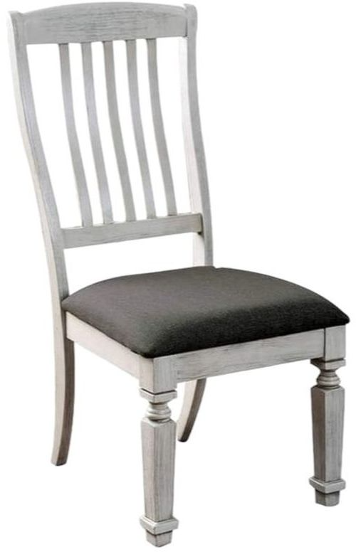 These country inspired chairs are cozy and homey. Classically shaped table legs create a traditional visual. The gray fabric and dark nailhead is composed and brings that warm rustic charm to your dinning set.