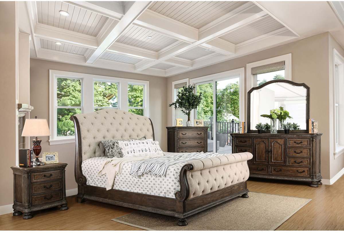 Luxury and style blends together to make this beautiful contemporary sleigh bedroom set. The fabric padded headboard and footboard provide warm comfort and paired button tufted details offer an extravagant finish. Case goods feature antique handles and the rustic natural wood finish creates a soothing bedroom environment. Make your sleeping area feel like a luxurious getaway with this extraordinary bedroom set!Read More