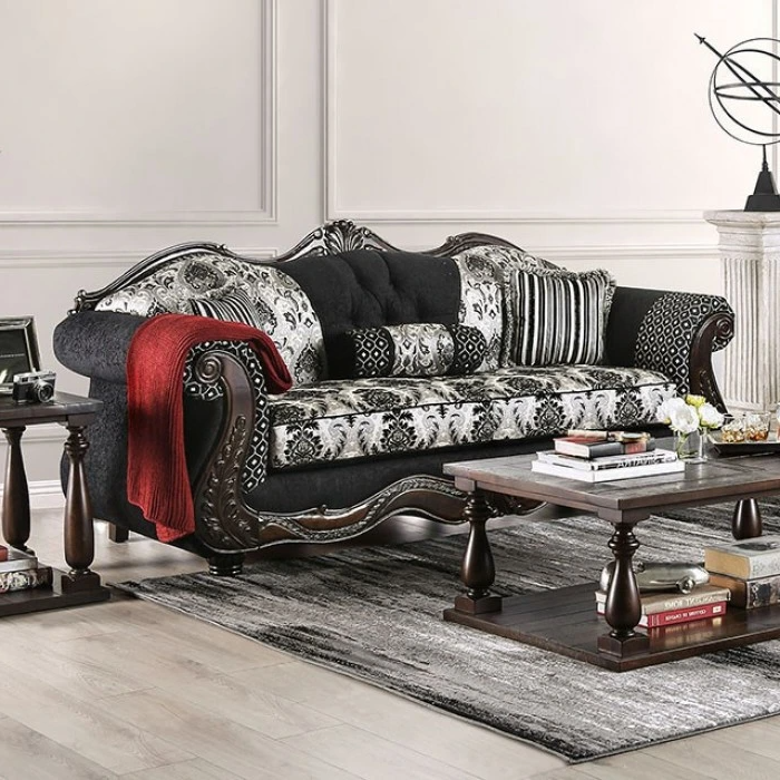 Each plush cushion is encased in black welting, and the rolled arms feature wooden accents, creating an antique refinement perfect for the focal point of your living room.