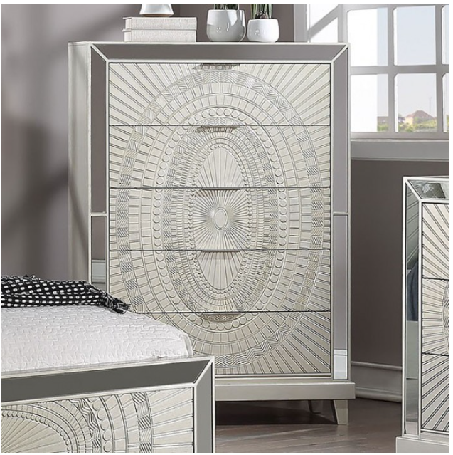 Gracing the panels of this chest is an intricate play of radial and circular lines, engraved in polyresin material. Your eyes are drawn towards this beautiful pattern reminiscent of the art deco era. Mirror panels line each front edge, adding to the luxurious appeal.Read More