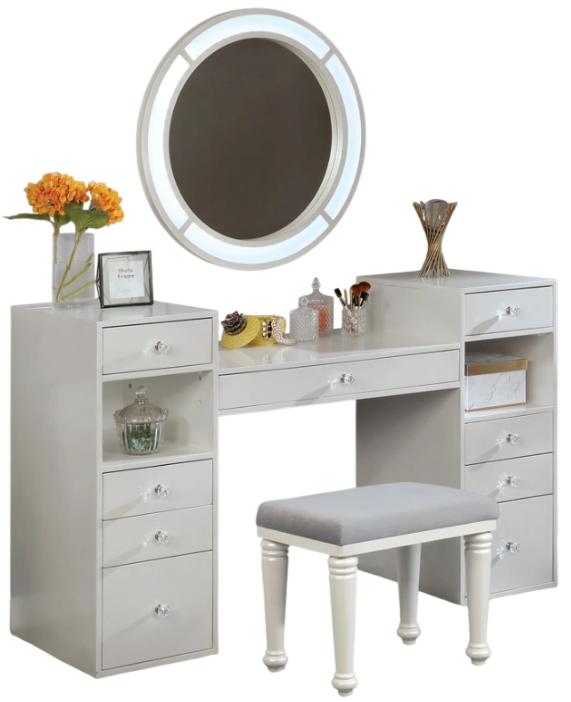 Preserve all of the glamour of show business with this set that is fit for a star! Multitude of drawers and open shelf make this an ideal setting for any woman, young or old.Read More