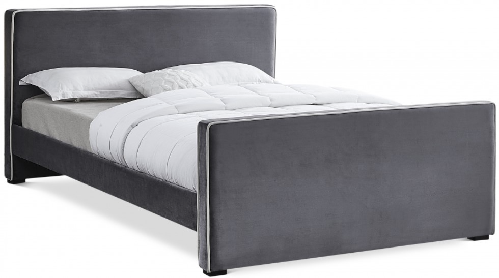 Lend your bedroom an elegant look with this Dillard velvet bed. Live out your velvet fantasy with this bed's soft grey velvet upholstery that runs the full length of the bed from headboard to footboard and is trimmed with velvet piping in a contrasting color for a contemporary vibe.Read More