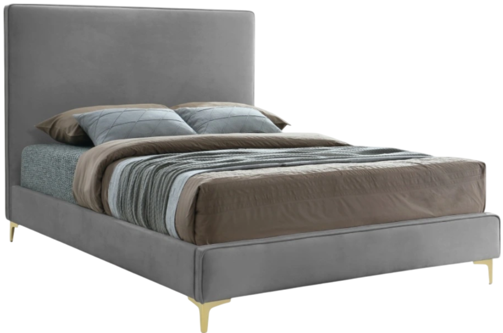 Provide yourself with a few options when you choose the sleek Geri grey velvet full size bed. The headboard, side rails and footboard are all cushioned and upholstered, with snazzy decorative piping on the headboard and footboard. This bed comes with two different sets of legs so you can match your other decor.Read More