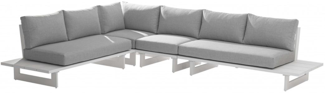 This modular sectional has gray water resistant fabric with a base made from white aluminum, so it's sturdy, tough, and ready to face the elements with impeccable beauty, season in and season out. Shop the contemporary pieces in this collection to create the outdoor entertaining area of your dreams.