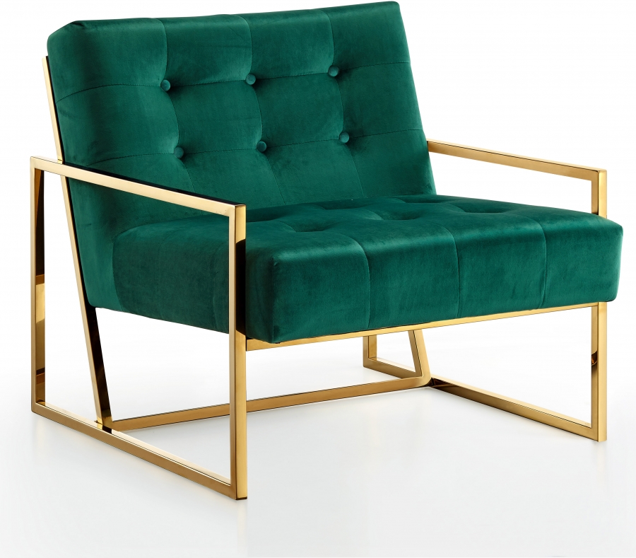 Give your room a touch of elegance and refinement with this ultra modern Pierre green velvet accent chair. The base is made from stainless steel, so it's durably tough and strong enough to withstand heavy daily use. The base is finished in a gold tone hue, adding to its luxurious feel. Tufting on the thick back and seat cushions add to their durability and give it a welcoming look. The green color makes the chair an easy fit with existing furnishings.