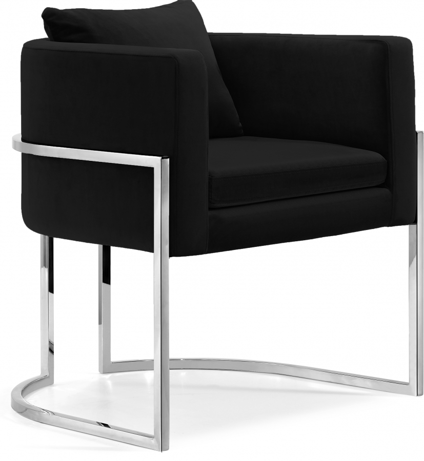 Make your living quarters stand out with this unique black velvet Pippa accent chair that conveys your own special flare. Its stocky curved back is upholstered with plush black velvet, providing you with a soft, comfortable place to rest while sitting and drinking coffee or reading a book after a long day. Rich chrome stainless steel legs give this chair a contemporary design that is sure to stand out among your existing modern decor.