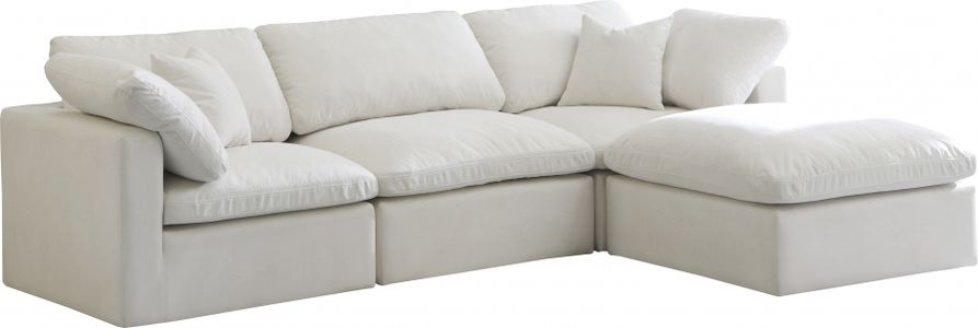 The soft cream velvet material is soft and welcoming to the touch, and the set's cushions are overstuffed with a down and feather blend to provide ample support for tired bodies.