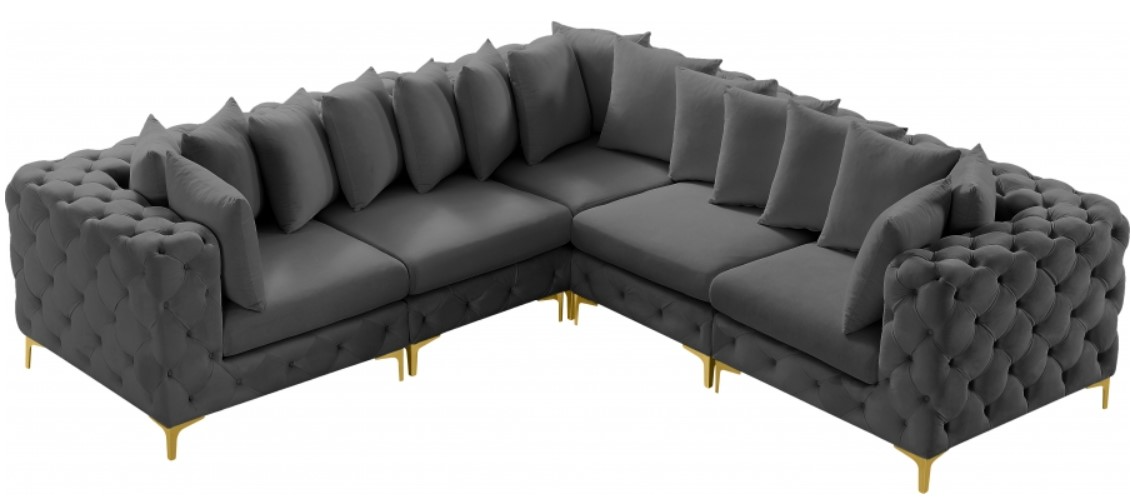 Lean back and relax on this Tremblay sectional. Featuring soft grey velvet upholstery with deep button tufting, this sectional adds a bold touch to any living space. A complete set of gold and chrome legs are included, so you can change it up to suit your home décor.Read More
