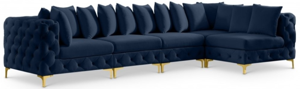 Lean back and relax on this Tremblay sectional. Featuring soft navy velvet upholstery with deep button tufting, this sectional adds a bold touch to any living space. A complete set of gold and chrome legs are included, so you can change it up to suit your home décor.Read More